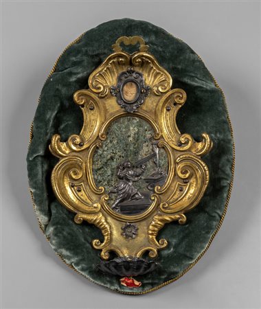 Lotto 0003 Placca devozionale in argento ed argento dorato raffigurante il Battesimo di Gesù cornice in legno intagliato e dorato sec.XVIII