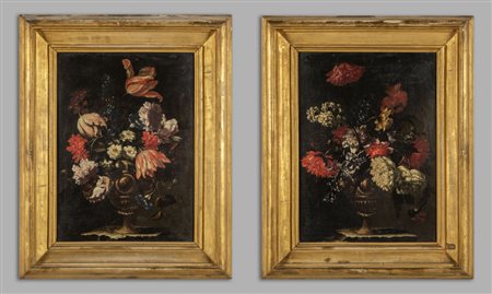 Lotto 0007 Scuola lombarda sec.XVII 'Vasi di fiori' coppia di olii cornici in legno intagliato e dorato