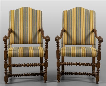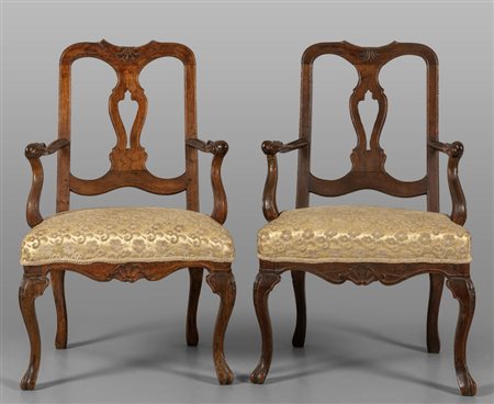 Lotto 0017 Coppia di poltrone Luigi XIV in noce schienale ad otto con conchiglia intagliata nella parte superiore Emilia sec.XVIII