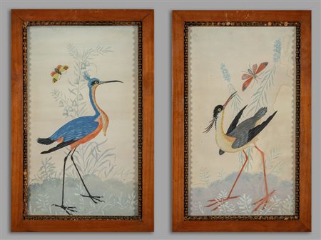 'Uccelli con farfalle' coppia di tempere su carta