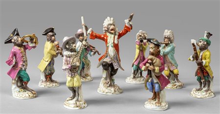 Lotto 0024 Otto scimmie suonatrici con il direttore d'orchestra Meissen sec.XX