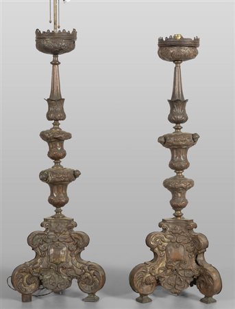 Lotto 1005 Coppia di candelieri in rame montati a lampada sec.XVIII