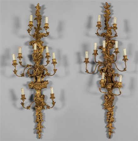 Lotto 1015 Coppia di grandi apliques in stile Luigi XV a nove luci in legno intagliato e dorato