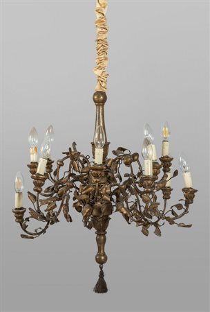 Lotto 1017 Lampadario a 12 luci in ferro dorato e legno sec.XIX