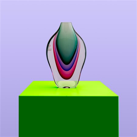 Vaso in vetro sommerso nei toni del verde, viola, arancio e trasparente.