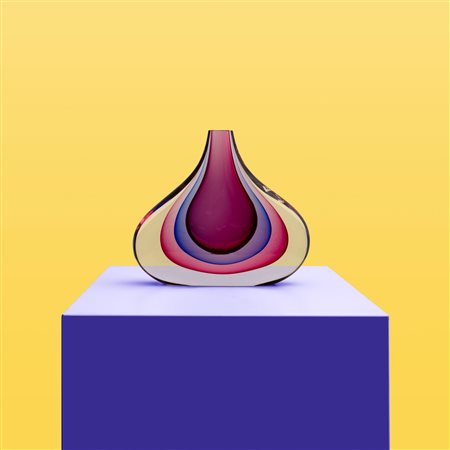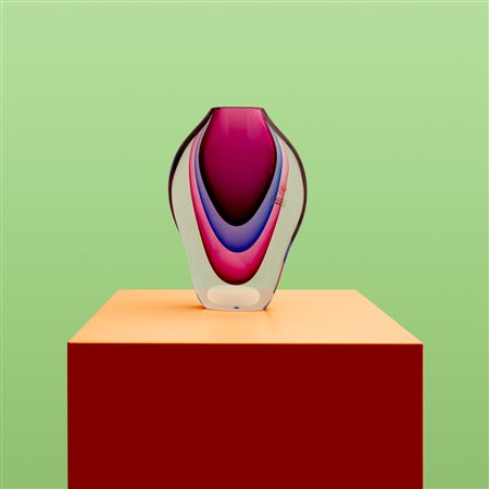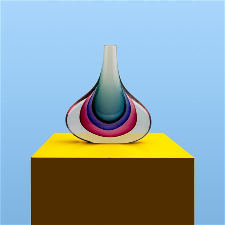 Vaso in vetro sommerso nei toni del viola, blu, rosso e trasparente.