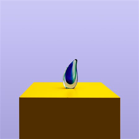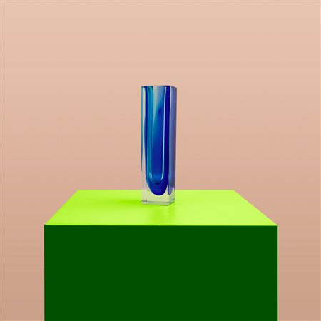 Vaso in vetro sommerso nei toni del blu e trasparente attribuito alla produzione di Oball, Murano. -