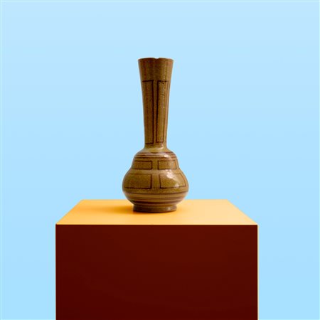 Bottiglia con tappo, in vetro acidato nei toni del verde.