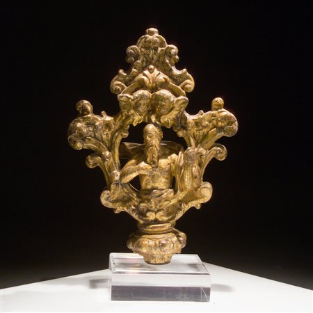 Lotto 14 Antico puntale in legno dorato, dotato di base in plexiglass. Dimensioni complessive 37x23.5x11.5 cm.