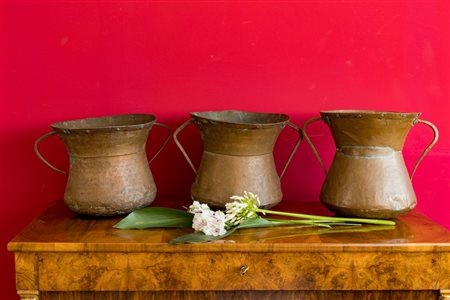 Lotto 6 Tre vasi biansati in rame martellato