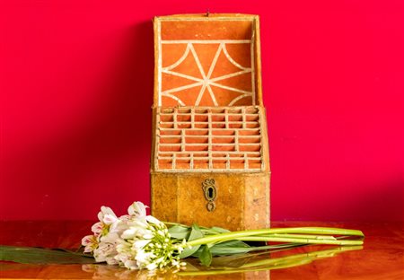 realizzato con piano ottagonale da aprirsi con vani interni portaoggetti, su fusto tornito e intagliato con tre gambe mosse