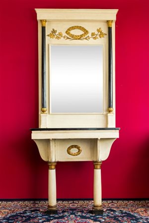 realizzata in stile Impero, specchiera inquadrata da due colonne ebanizzate e con fregio superiore di foglie di quercia, console con piano rettangolare in marmo nero di epoca posteriore, due colonne con capitelli dorati e fregio a corona di foglie di quercia