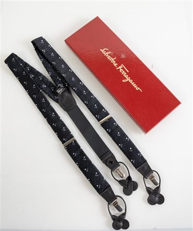 Lotto 3 SALVATORE FERRAGAMO Bretelle in seta a fantasia sui toni del nero, blu e grigio, rifiniture in pelle e dettagli in metallo argentato. Lunghezza massima cm 115. Lunghezza minima cm 80. Larghezza stringhe cm 3,5. Composizione 100% seta. Reca etichetta Salvatore Ferragamo, Made in Italy. Corradate da scatola.