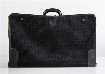 Lotto 6 FENDI Valigia portascarpe in tela monogram Zucchino con inserti in pelle nera e metallo dorato. Cm 36x59x17; altezza con manico cm 43. Reca marchi FF ed etichetta FF Fendi sas Roma Made in Italy. (difetti)