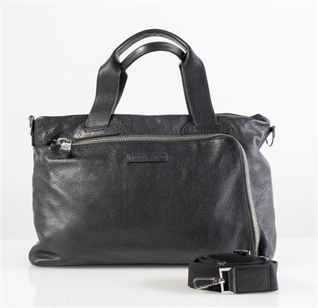 Lotto 7 EMPORIO ARMANI Borsa da lavoro in pelle martellata nera. Cm 28x442x10; manici cm 50. Dettagli in metallo argentato. Reca tracolla regolabile. Sul fronte reca una tasca con diversi scomparti. All'interno reca tre tasche. Reca marchio Emporio Armani ed etichetta Emporio Armani Made in Italy.