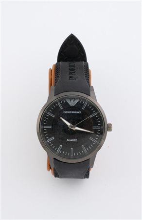 Lotto 10 EMPORIO ARMANI Orologio da polso modello AR-2433 111207. Movimento al quarzo e quadrante analogico. Cassa in accioio inox di mm 42. Cinturino in pvc nero. Reca marchi Emporio Armani e GA.