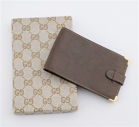 Lotto 17 GUCCI Portafoglio in pelle marrone con finiture in metallo dorato. Cm 8x13. Reca marchio Gucci per il Banco di Sicilia. Corredato da scatola.