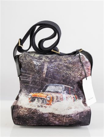 Lotto 18 PAUL SMITH Borsa a tracolla in tela con stampa “Mini Cooper”. Cm 26x24x11. Tracolla regolabile in tela. Finiture in similpelle nera e metallo dorato. All'interno reca una tasca. Reca marchi, etichetta e cartellino Paul Smith. Corredata da dustbag.