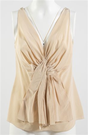 Lotto 21 PRADA Top senza maniche in chiffon di seta sui toni del beige. Collezione Primavera/Estate 2006. Taglia 44. Composizione 100% seta. Al retro reca cerniera in metallo brunito. Reca etichetta Prada, Made in Italy.