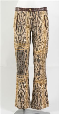 Lotto 22 ROBERTO CAVALLI Pantaloni in denim a fantasia animallier e catene con finiture in pelle marrone. Anno 2003. Taglia M. Composizione 96% cotone, 2% lycra e 2% poliammide. Reca marchi Roberto Cavalli, etichetta Roberto Cavalli Made in Italy e ologramma di autenticità.