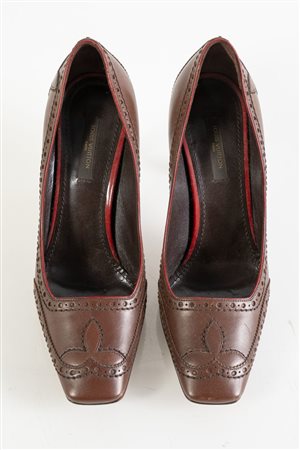 Lotto 23 LOUIS VUITTON Scarpe décolleté a punta squadrata in pelle marrone con ricamo con logo. Taglia; tacco altezza cm. Recano marchio Louis Vuitton Paris. (lievissimi difetti)