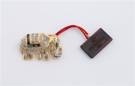 Lotto 184 VALENTINO Spilla a forma di elefante in metallo dorato ricoperto di strass e zaffiri sintetici. Cm 2,5x3,5. Reca marchio Valentino ed etichetta Valentino Bijoux.