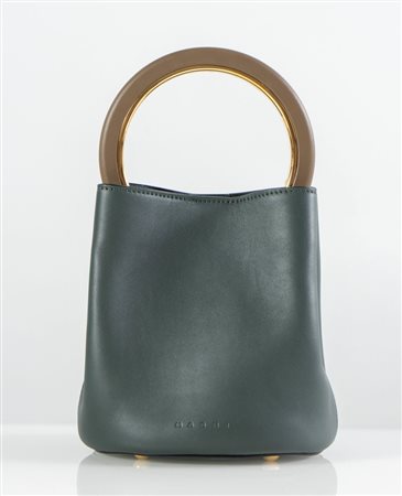 Lotto 185 MARNI Borsa a secchiello modello Pannier in pelle di vitello color petrolio con manico a cerchio in pelle nocciola e metallo dorato. Cm 19x18x15; altezza con manico cm 29,5. Tracolla removibile e regolabile. All'interno reca un astuccio. Reca marchio ed etichetta Marni, Made in Italy. Corredata da dustbag. (nuova)