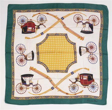 Lotto 186 CHRISTIAN DIOR Foulard in seta con disegno carrozze sui toni del bianco, verde, rosso, blu, giallo e marrone. Cm 89x86. Composizione 100% seta. Reca marchio Christian Dior. (lievissimi difetti)