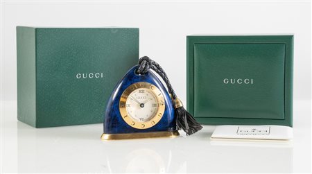 Lotto 187 GUCCI Timepieces Orologio da tavolo in metallo dorato, lapislazzuli e laccetti in pelle blu. Anno 1995. Cm 9x9x3. Movimento al quarzo. Modello numero 8500; numero di serie 005542. Reca marchi Gucci, Swiss Made. Corradato da scatola e garanzia internazionale Gucci.