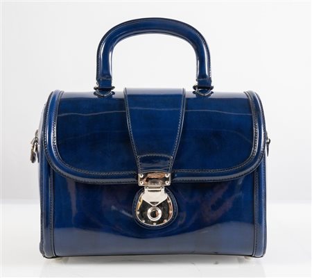 Lotto 188 MIU MIU Borsa a bauletto in vernice color cobalto. Collezione 2012. Cm 22,5x28x13,3; manico cm 30 e tracolla cm 100. Dettagli in metallo argentato. All'interno reca tre tasche. Reca marchio Miu Miu, codice di riferimento prodotto e certificato di autenticità. Corredata da dustbag.
