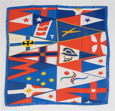 Lotto 191 LOUIS VUITTON Foulard in seta a fantasia sui toni del blu, rosso, bianco, giallo, nero e verde. Edizione limitata per la Louis Vuitton Cup del 2000. Cm 55x55. Composizione 100% seta. Reca etichetta Louis Vuitton Paris, Made in Italy e marchi Louis Vuitton Cup 2000. Corredata da dustbag.