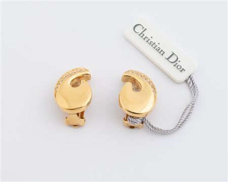 Lotto 193 CHRISTIAN DIOR Orecchini a clip in metallo dorato e strass. Cadauno di cm 3x2. Al retro recano marchi Chr Dior Germany e cartellino.
