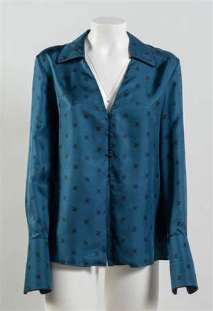 Lotto 196 FENDI Camicia in seta blu con monogram Karligraphy FF nero. Polsi chiusi da gemelli con monogramma Karligraphy. Collezione 2019. Taglia IT 44. Composizione 100% seta. Reca etichetta Fendi Roma, Made in Italy e ologramma di autenticità.