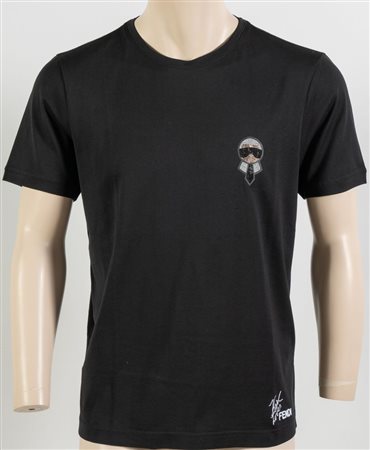 Lotto 197 FENDI x KARL LAGERFELD T-shirt modello Carlito in cotone nero con applicazioni di strass e ricamo Karl Loves Fendi. Taglia L. Composizione 100% cotone. Reca etichette Fendi Roma, Made in Italy e ologramma di autenticità.