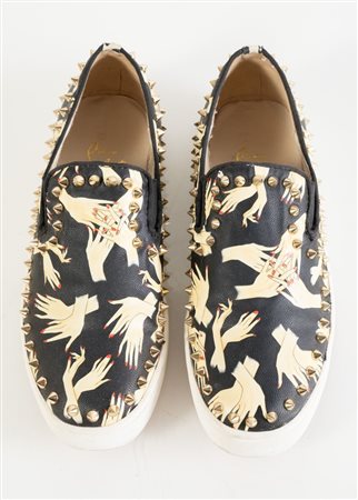 Lotto 198 CHRISTIAN LOUBOUTIN Scarpe modello slip-on Pik Boat in pelle nera con stampa e borchie in metallo dorato. Taglia non leggibile, ma 40. Recano marchio Christian Louboutin. (lievi difetti)