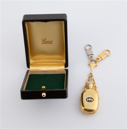 Lotto 204 GUCCI Ciondolo portaprofumo in metallo dorato con logo smaltato nero. Anni '70. Cm 11x2,5. Reca marchi Gucci Italy e GG. Corredato di scatola. (lievi difetti)