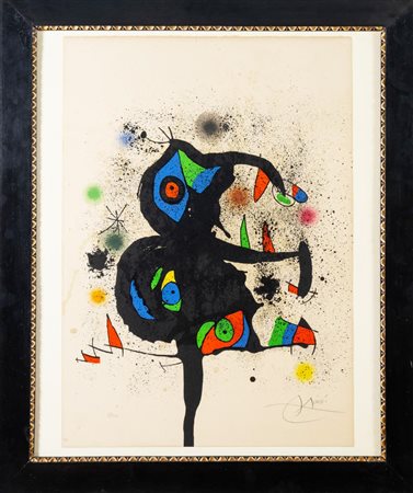 Lotto 13 Joan Mirò (Barcellona 1893 - Palma di Maiorca 1983), “Sculture et Montagne”, 1973.Litografia a colori su carta Arches, firmata in basso a destra, numero di tiratura in basso a sinistra 5/150, reca filigrana “Arches/France”, H cm 77.5x54.5 (cornice non inclusa)