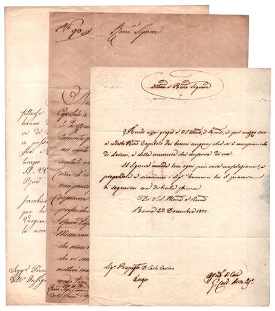 Ecclesiastico e diplomatico, vescovo di Bagnorea (1833-36) e poi nunzio (1836-42) in Colombia, trasse da quell'esperienza un importante libro ("L'America un tempo spagnuola riguardata sotto l'aspetto religioso", 1844). Fu poi arcivescovo di Camerino (1842), vescovo di Imola e infine Cardinale (1846). Tre lettere firmate, risalenti agli anni 1850-1858. La prima diretta al canonico Bosi, prevosto del R.mo Capitolo di Lugo. "Non sono punto soddisfatto della risposta di codesto R.mo Capitolo 4 corrente, in ordine alla Messa letta che ne' giorni feriali di Quaresima deve celebrarsi in codesta Collegiata immediatamente prima della predica...". Le altre sono dirette al prevosto Carlo Cavina e canonici della collegiata di Lugo e riportano auguri natalizi. Quattro pagine in-4, su bifolii. -
