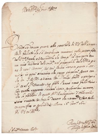 Prelato e diplomatico, nunzio apostolico dapprima nel Granducato di Toscana (1631-1634), e in Francia (1634-1639), nominato vescovo di Rieti nel 1639, è noto soprattutto per aver censurato il 'Dialogo sopra i massimi sistemi del mondo' di Galileo Galilei nel 1633. Lettera firmata, datata Roma 16 gen. 1671, in risposta agli auguri "del S.mo Natale". Una pagina in-4, su bifolio. -