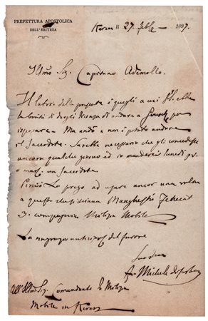 Lettera autografa firmata del frate cappuccino, missionario e esploratore - primo Prefetto Apostolico dell’Eritrea - diretta al Capitano Ademollo che viene pregato di prolungare la licenza ad un soldato che si deve sposare. Keren, 27 febbraio 1897. "Il latore della presente è quegli a cui V.S. ebbe la bontà di dargli licenza di andare a isposare. Ma andò e non è potuto andare il sacerdote". Una pagina in-8 su carta intestata 'Prefettura Apostolica dell’Eritrea'. -