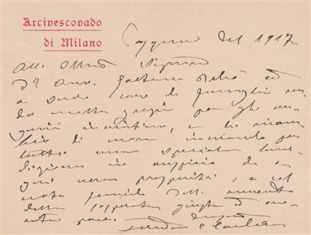 Lettera autografa firmata, datata Pasqua del 1917 dell'illustre prelato, arcivescovo di Milano dal 1894 al 1921, creato Cardinale da Leone XIII nel 1894, in risposta agli auguri ricevuti dall'avvocato Gaetano Deho. Definito dai contemporanei come ottimo pastore e teologo, venne in seguito accusato di modernismo: ciò lo portò in contrasto con papa Pio X che egli stesso aveva inizialmente sostenuto come patriarca di Venezia. Le relazioni tra i due si ammorbidirono infine nel 1912, ma monsignor Ferrari riuscì a recuperare solo con l'elezione di Benedetto XV al soglio di Pietro. La causa per la sua canonizzazione si aprì nel 1963, al termine della quale ottenne il titolo di Servo di Dio. Proclamato venerabile nel 1975 da Paolo VI (uno dei suoi successori alla cattedra episcopale milanese), venne proclamato beato da papa Giovanni Paolo II nel 1987.