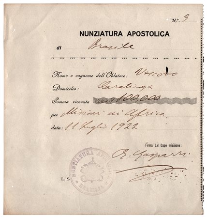 Documento autografo firmato datato 11 Maggio 1922 dell'ecclesiastico, Cardinale dal 1907 e Nunzio Apostolico in Brasile. Quietanza di pagamento "per missioni in Africa". Una pagina in-8 (modulo a stampa). -