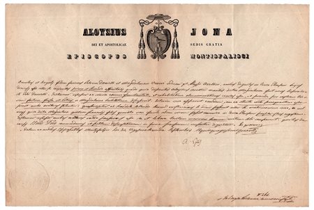 Firma autografa su documento manoscritto datato Montefalisci hac die vigesima secunda Septembris 18quinquagesimiquarti del vescovo di Montefiascone (dal 1854), relativo alla vicenda di una vedova, Maddalena, che, resa gravida da un altro uomo, faticava ad accasarsi. Lo Jona ospitò Pio IX in visita a Montefiascone nel Palazzo vescovile. Promulgò avvisi sacri sia in occasione della proclamazione del dogma dell’Immacolata sia per chiedere preghiere e atti di pietà ai fedeli per lo scampato pericolo dall’epidemia di colera che imperversò nella Tuscia nel 1855-1856. Una pagina in-4 obl., in latino, su carta intestata. -