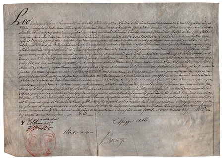 Nel lotto anche una seconda lettera-patente su pergamena, datata 18 settembre 1471, nella quale Martino, luogotenente di Francesco Calandrini, vescovo di Bologna, incarica il reverendo Giovan Paolo di pagare cento lire per accompagnare il De Grati. Presenta sottoscrizioni di numerosi personaggi tra cui Alessandro Arrivabeni e sigillo in ceralacca perfettamente conservato. Una pagina. -