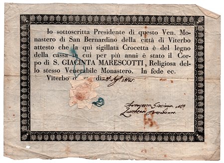 Documento a stampa (in parte manoscritto) datato Viterbo 28 Agosto 1843 firmato dal Presidente del Monastero di San Bernardino della città di Viterbo nel quale si attesta "che la qui sigillata crocetta è del legno della cassa in cui per più anni è stato il Corpo di S. Giacinta Marescotti, Religiosa dello stesso Venerabile Monastero". Una pagina in-8 obl. Su carta filigranata con sigillo in ceralacca rossa sotto carta.