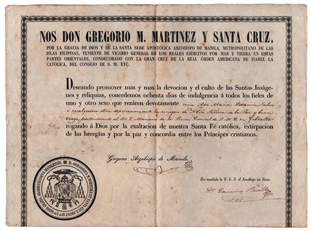 Documento a stampa (in parte manoscritto) dell’Arcivescovo di Manila dal 1861 al 1885, padre conciliare nel I Concilio Vaticano. Concessione della indulgenza di 80 giorni al Console del Re di Spagna a Gibraltar, Mariano de la Boca, per aver venerato l'immagine della Madonna della Pace e del buon viaggio. "Deseando promover mas y mas la devocion y el culto de las Santas Imagenes y reliquias, concedemos ochenta dias de indulgencia à todos los fieles de uno y otro sexo que rezaren devotamente una Ave Maria, Letani, Salve, o qualquiera otra deprecacion ante la imagen de N.ra Senora del la Paz y buen viaje…". Una pagina in-8 obl., timbro arcivescovile.