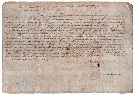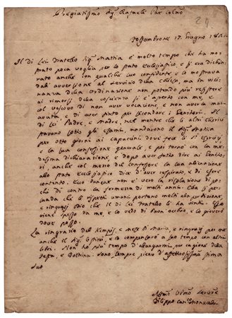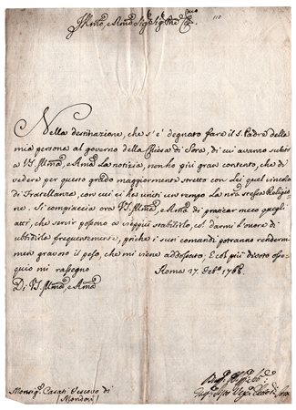 Lettera firmata, datata 'Roma 27 Feb. 1768' dell'ecclesiastico, vescovo di Sora (dal 1768 alla morte) diretta a Monsignor Casati, vescovo di Mondovì, al quale comunica di essere stato prescelto per il prestigioso incarico di vescovo: "Nella destinazione, che s'è degnato fare il S.Padre della mia persona al governo della Chiesa di Sora di cui avanzo subito a V.S. Ill.ma e R.ma La notizia...". Una pagina in-4.