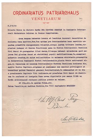 Firma autografa su lettera dattiloscritta datata 'Venezia 7 settembre 1945' del Cardinale e Patriarca di Venezia Adeodato Piazza. Nacque a Vigo di Cadore il 30 settembre 1884 e fu battezzato col nome di Giovanni. Entrò nell'Ordine dei Carmelitani Scalzi e nel 1907 emise a Venezia i voti solenni prendendo il nome di Adeodato di San Giuseppe e, l'anno seguente ricevette l'ordinazione sacerdotale, a Venezia, per imposizione delle mani del cardinale Aristide Cavallari, patriarca di Venezia. Fu insegnante di filosofia e teologia e, durante la prima guerra mondiale, cappellano militare. Pio XI elesse Piazza Arcivescovo di Benevento nel 1930, carica che tennefino al 1935. Sempre Pio XI lo elevò al rango di cardinale presbitero nel concistoro del 1937. Nel 1938 pubblicò una lettera pastorale in cui giustificava la legislazione antisemita italiana, affermando: "Sono gli stessi ebrei, con i loro comportamenti, che in ogni tempo e in ogni luogo provocano queste reazioni". Uomo di carattere risoluto, durante il secondo conflitto mondiale ottenne che grosse partite di derrate alimentari giungessero in città; insieme a mons. Olivotti iniziò un'opera di assistenza per migliaia di ragazzi bisognosi di cure. Il 2 aprile 1945 fu padre Giulio Mappelli, incaricato dal cardinale, ad accompagnare i membri del CLN al comando tedesco dove fu raggiunto l'accordo per l'abbandono di Venezia da parte delle truppe di occupazione. Denunciò, con il vescovo di Trieste e Capodistria, le barbarie dell'immediato dopoguerra che avvenivano in territorio giuliano, istriano e dalmata. Nel 1948 papa Pio XII lo nominò segretario della Sacra Congregazione concistoriale, e quindi cardinale vescovo il 14 marzo 1949. La missiva, diretta al rettore del Seminario Patriarcale Ettore Bressan, verte su questioni relative alla Basilica di San Marco di Venezia: "Te, exemplari modestia ornatum, de cuius sollecitudine in animarum ministerio, praesertim in Moderatione Seminarii Nostri Patriarchalis Nostrae Basilicae hodierna die, audito nostro Capitulo, elegimus et nominamus cum omnibus privilegis...". Una pagina in-4, su carta intestata. Unita busta. -