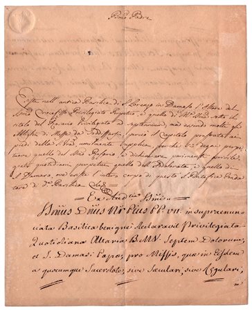 Documento manoscritto datato 'die 15 Julii 1823', scritto un mese prima della morte del Pontefice. La supplica è rivolta al Santo Padre: "...perché si degni perpetuare..." alcuni altari nella Basilica di San Lorenzo in Damaso, presso Roma, "... quello del SSmo Rosario...quello del'Addolorata e quello di S.? Damaso, ove esiste' l'intero corpo di questo S.? Pontefice fondatore di I.a? Basilica." La Basilica di San Lorenzo in Damaso è una delle chiese di Roma dalle origini più antiche. La tradizione vuole che nel 1577 il Cardinale Alessandro Farnese il giovane abbia fatto traslare le spoglie di Papa Damaso I, insieme a quelle di Papa Eutichiano, nella basilica. Riccamente adornata di opere d’arte, nel 1798 fu trasformata in scuderie per le truppe francesi di Napoleone e gravemente deteriorata. Venne quindi restaurata da Giuseppe Valadier nel 1807 e nel 1816-1820, quando fu eliminata la confessione che, insieme all’abside, Gian Lorenzo Bernini aveva realizzato nel 1640 per volere del cardinale Francesco Barberini, trasformando il presbiterio in sontuose forme barocche. Ulteriori restauri furono eseguiti nel 1868 da Virginio Vespignani che ripristinò le linee rinascimentali della chiesa, eliminando quasi del tutto gli interventi successivi. La chiesa assunse così l’aspetto attuale, fatta eccezione del soffitto ligneo, ricostruito in seguito all’incendio del 31 dicembre 1939. Due pagine in-8, su bifolio, sigillo in cera sotto carta. -