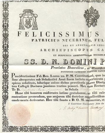 Diploma a stampa datata 'E Camertinae Universitatis Aula die 21 Julii 1847'. Sulla base della Costituzione apostolica emanata nel 1824 da Leone XII 'Quod Divina Sapientia' l'alto prelato conferisce il primo premio in 'Schola Pathologiae' ad Agostino Baroni. Il documento costituisce uno tra i primi atti emanati nel lungo governo del Salvini, che resse la cattedra di Camerino dall’aprile 1847 sino alla morte nel 1893 e alle ampie consuetudini instaurate tra la sede arcivescovile e l’università locale. In-Folio. Bel sigillo in cera sotto carta, ottimamente conservato. -